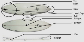 1)Surf: Le tavole destinate specificamente al surf sono spesso corte, mostrano un nose (punta) e un tail (coda) più stretti e un rocker (curva) più accentuato. Queste caratteristiche le rendono più maneggevoli nelle onde, ma anche più lente, meno stabili e direzionali su acqua piatta.